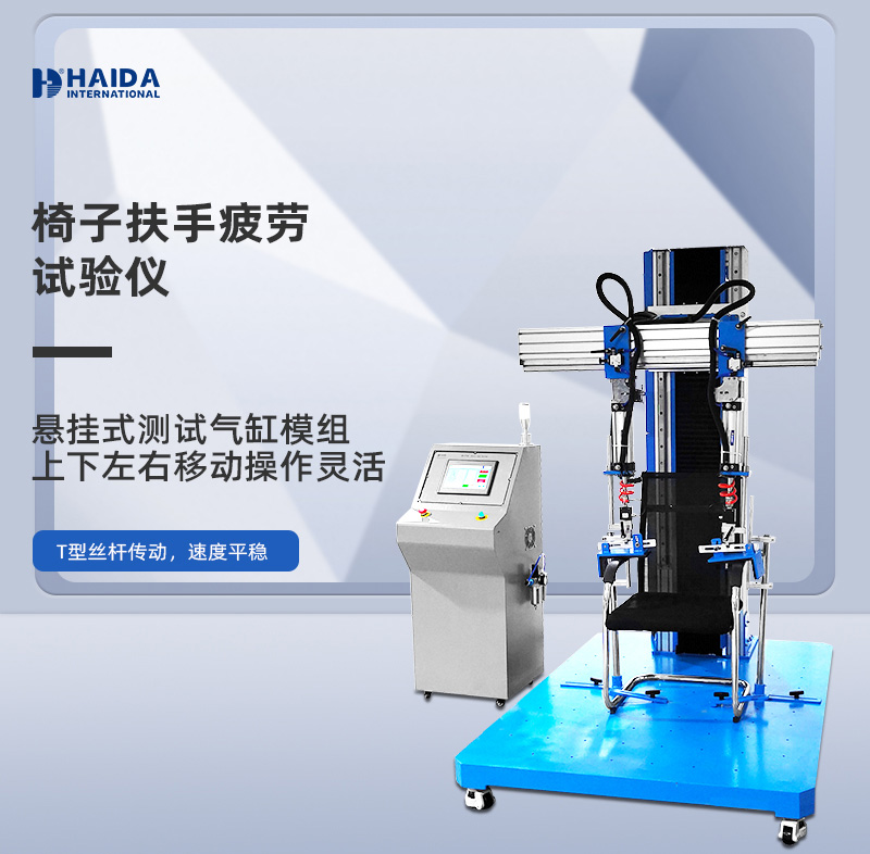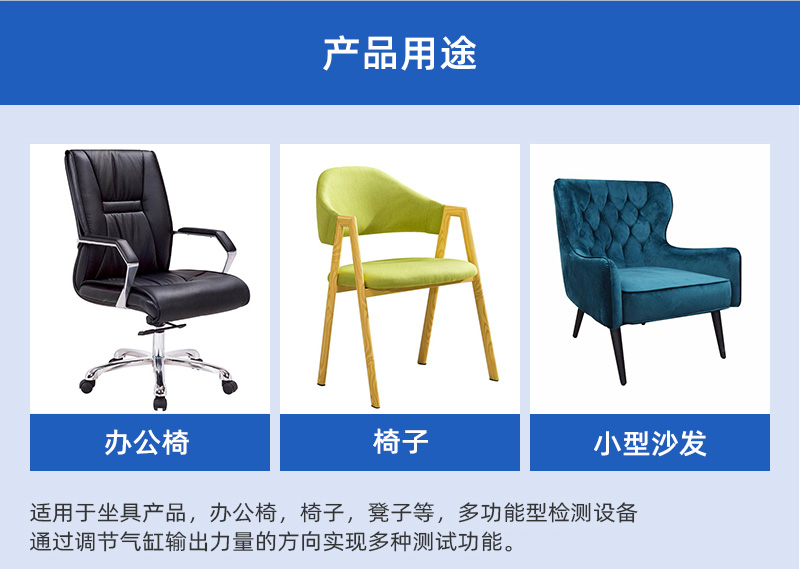 本試驗機模擬辦公椅的使用情況,測試椅子扶手結構抵受垂直壓力和重復荷載壓力的能力,此荷載可以看做作是離開座位時把扶手作為支撐而產生的力。除扶手測試外,本機 還可以用于椅腳強度測試和腳踏耐用性測試。 Bifma x 5.1 clause 18 Leg strength test (椅腳強度) Clause 19 Footrest static load test – vertical(腳踏測試-垂直) Clause 20 Footrest durability test – vertical-cyclic(腳踏測試垂直環) Clause 21 Arm durability test – cyclic (扶手耐用性循環測試) | ||