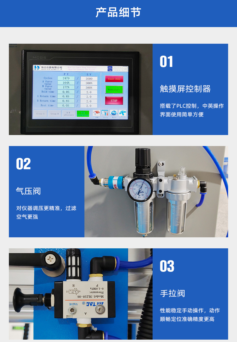 1、2組氣動致動器可做10度活動式傾斜安裝或垂直固定式安裝. 另外2組水平安裝致動器可作椅腳水平推力測試,此兩組水平安裝制動器調節范圍20mm~250mm, 推力為0-60kg. 左右兩邊的制動器可單獨工作或同時工作。 2、扶手高度調節范圍:550mm ~950mm 3、推力可調,持壓時間可調 4、試樣尺寸寬度:0-1000mm 5、測試速率:10~30次/min 6、致動器前端設計可輕松裝卸不同的加載塊 7、帶力值、峰值顯示 8、垂直致動器出力:0-100kg 9、水平推力:0-70 kg 10、配件: 38 mm 高擋塊 x 2 件 扶手加載塊 1 對 11、動作模式:可單獨控制左邊、右邊制動器工作或同時工作 | ||