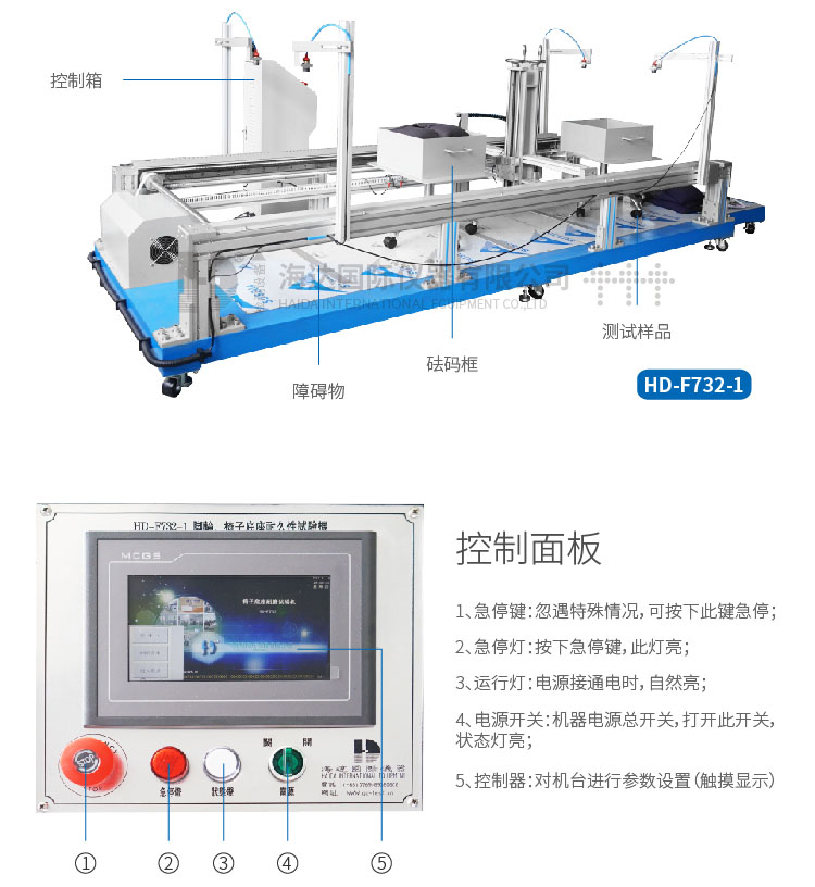 1、腳輪往復磨損試驗: 1)速率(可調):8-12次/min(輕工、Bifma)、6次/min(En要求) 2)測試次數:2000次通過障礙塊、98000次拆除障礙塊(輕工、Bifma) 3)障礙塊:3塊鋼板 4)加載物: a) Bifma標準:113Kg(249lb); b) QB/T標準:102Kg(225lb); c) EN標準:110KG(243lb) 5)測試行程:≥762MM(30in) 2、滾動、滑動阻力測試儀 1)速率(可調):50±5mm/S 2) 測試行程:≥550MM 3)施力部位:離地面200±5mm處 3、控制模式:PLC 和觸摸屏操作 1.加載砝碼 :122KG(一套) 2.測試速度:10±2 次/min 3.顯示方式 :觸摸屏顯示 4.控制方式 :PLC控制 5.測試次數:1-999999次(任意設定) 6.電源:AC /220V、3A、50HZ 7.整機功率:0.2KW 8.氣壓:≥6kg/cm² 機臺尺寸:LxWxH=3000x1000x1500 mm <主要配件>: 1.砝碼盤13kg:1個 2.椅腳障礙塊:1套(3個短2個長) 3.限位夾具:2個 4.插銷桿:2個 5.轉動夾具:一個 6.鋼珠袋:10kg x 10袋,5kg x 1袋,1kg x 5袋 | ||