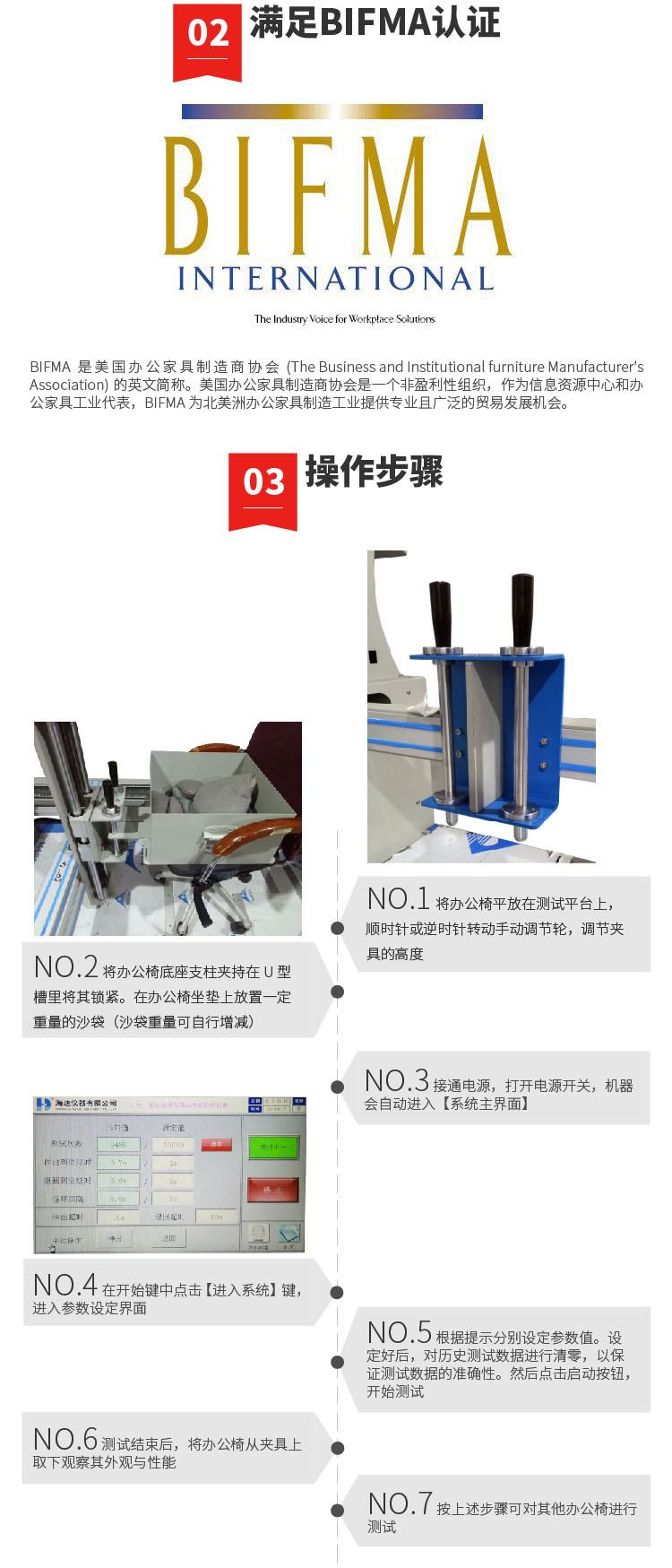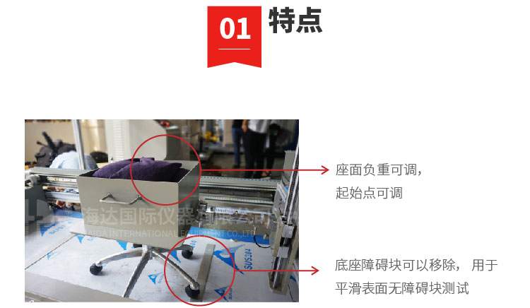 本機適用于所有帶腳輪或椅輪的辦公椅,評核腳輪及椅框對于抵受椅子前后移動所引起的疲勞壓力及磨損能力。 設計標準:Bifma5.1 第17節;Bifma 5.5 第8 節;Bifma 5.9 第11節 | ||