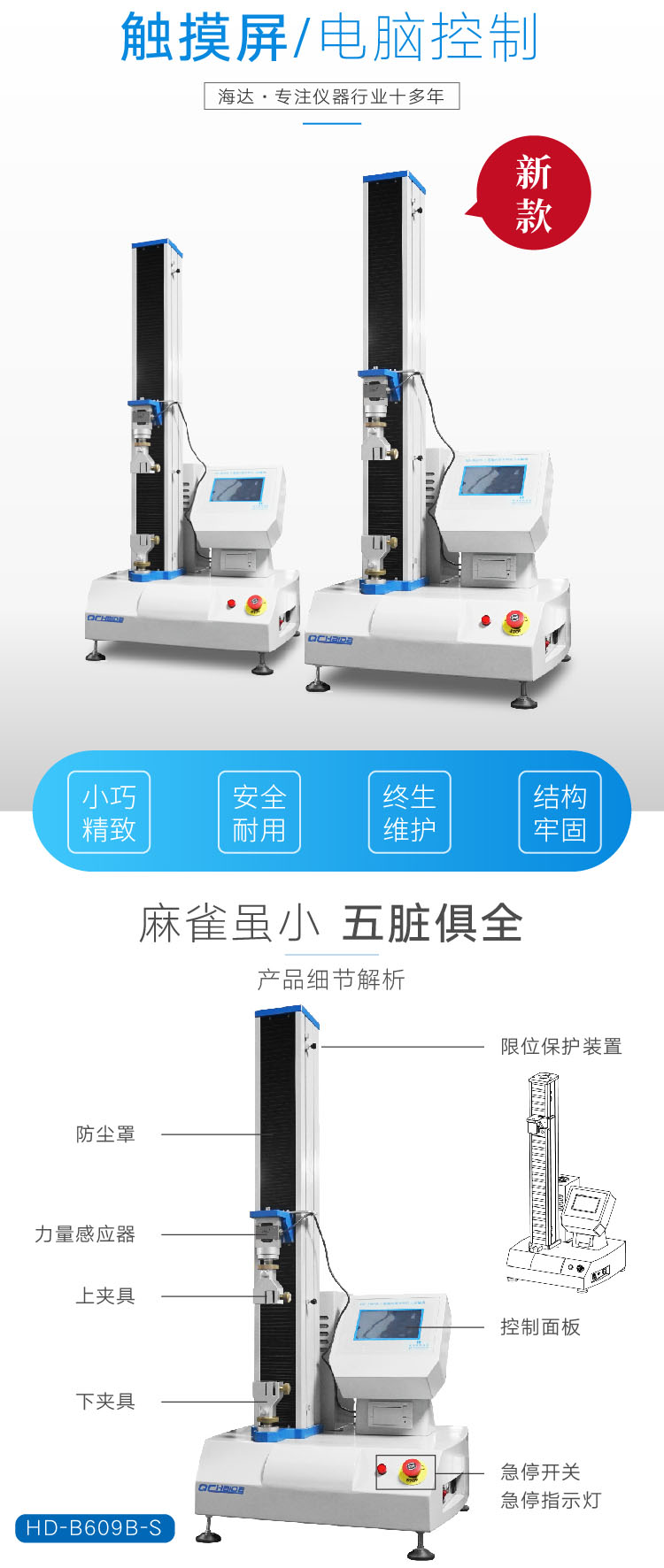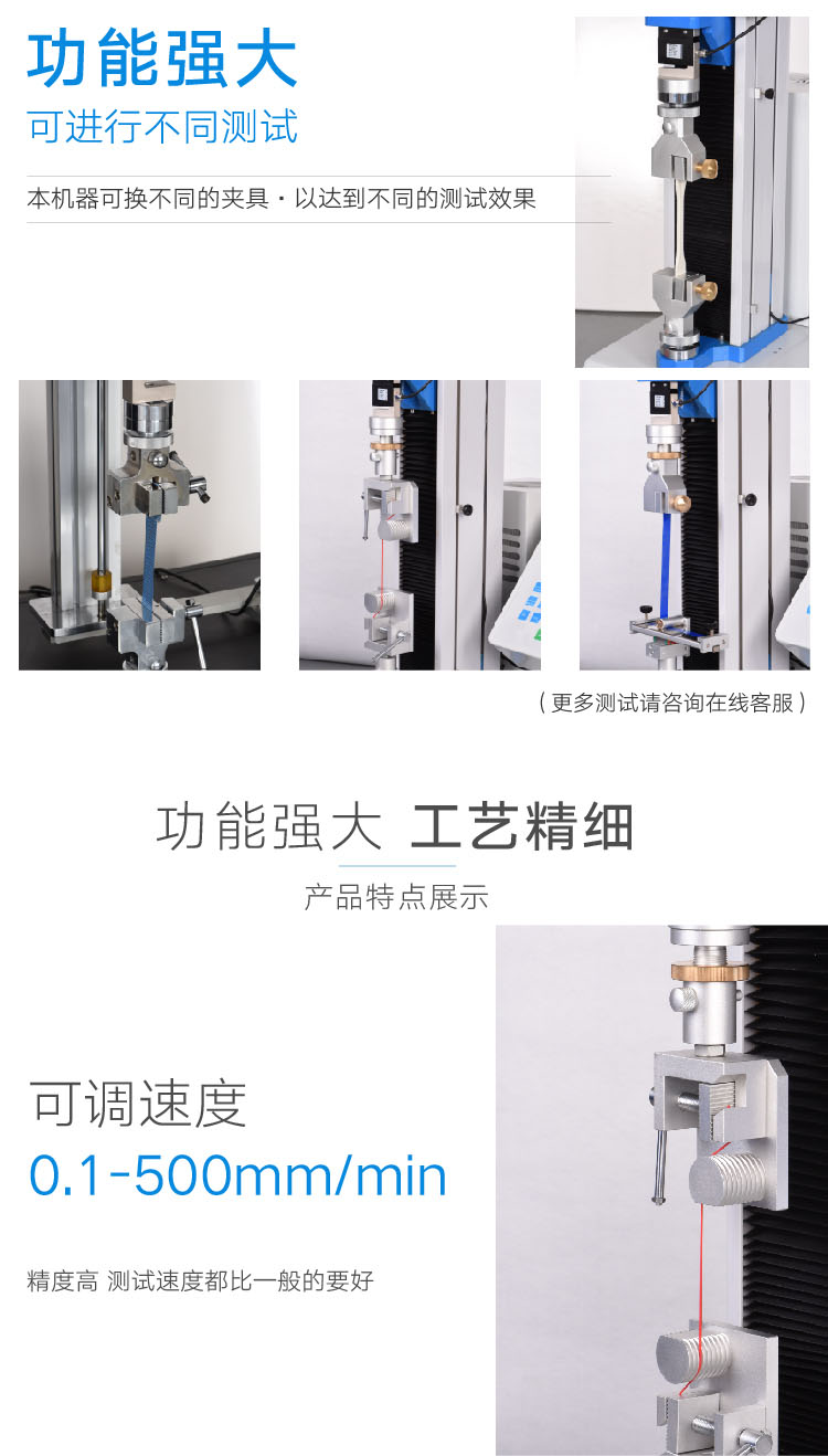指標參數容量5kg,10kg,15kg,20kg,30kg,50kg,100kg,200kg,可選電機400w松下伺服電機驅動器400w松下伺服驅動器絲桿進口滾珠絲桿控制方式面板控制(觸摸屏),可連電腦速度可調0.1-500mm/min最大行程900mm(不含夾具)荷重分解度1/250,000荷重精度≤0.5%單位切換gf/kgf/N//kN/LBf/T外形尺寸520*515*1250mm(L*W*H)凈重約70KG電源AC 220V整機功率500W 海達多功能拉力試驗機型號用途對比以下多功能材料試驗機可進行:抗拉強度、抗壓強度及伸長量,可做剝離、撕裂、抗彎、抗折、壓縮等試驗。適用:膠帶、標簽、膠黏劑、保護膜、鍍層、金屬、電子、電線電纜、防水卷材、PCB材料、鋁合金、編織袋、塑料、橡膠、無紡布、安全帶等很多行業材料。型號款式特點容量1kg=9.8N測試功能適用材料HD-B602單柱電子式,經濟型200kg拉伸、壓縮、彎曲、撕裂、延伸率、剝離、剪切、粘接力、高粘剝離測試端子拉力、塑料件拉伸、密封圈……HD-B609單柱電腦式 雙顯200kg薄膜、塑料、離型紙/膜、膠帶、紙張、復合帶、打包帶、鋁箔、保護膜、鋁塑板……HD-B609B-S單柱電腦伺服式200kg薄膜、離型紙/膜、膠帶、紙張、復合帶、打包帶、鋁箔、保護膜、鋁塑板、鏡片(抗壓)、吸波材料(抗壓)……HD-B617 單柱電腦式雙顯500kg線束、端子、橡膠、塑料……HD-B617-S單柱電腦伺服式500kg線束、端子、橡膠、塑料……HD-B603雙柱 門式電腦式2T拉斷、拉伸、抗壓、三點抗彎、四點抗彎曲測試 、撕裂、剪切等 電線電纜、木材、某些金屬、塑料、打包帶、背包、塑料桶(抗壓)、焊接點、安全帶(拉伸)、防水卷材(拉伸)……HD-B604-S雙柱門式電腦伺服式2T電線電纜、橡膠、鏈輪、PVC手套、木材、打包帶、某些金屬、焊接點、木地板鎖扣 ……HD-B604B-S雙柱門式電腦伺服式2T電線電纜、橡膠、鏈輪、PVC手套、木材、打包帶、某些金屬、焊接點、木地板鎖扣、安全帶(拉伸)、防水卷材(拉伸)……HD-B615-S雙柱門式電腦伺服式5T金屬、鋼絲、鋼絲繩……HD-B612-S雙柱門式電腦伺服式10T~30T拉伸、壓縮、彎曲、粘合、剪切、環剛度、彈簧拉壓金屬板材、鋼絲、鋼管、鋼板、鋼筋……HD-B616雙柱門式油缸下置式30T/60T/ 100T抗拉、抗壓、屈服強度等金屬板材、鋼絲、鋼管、鋼板、鋼筋……HD-B607-S雙柱門式高低溫環境 電腦伺服式3T高低溫、抗拉、抗壓等塑料、橡膠……夾具提示:200多款不同夾具,具體需依據客戶具體測試樣品選型。備注:以上參數僅供參考,為對客戶負責,具體材料選型請以銷售溝通后為準。 產品特點 (一)結構特點 1.機殼采用A3鋼板,使用精密激光切割及數控折床彎折、焊接成型,附著光澤白與金屬藍配色的烤漆涂裝; 2.采用雙顯雙控的操作系統,可連接電腦通過軟件進行試驗,也可通過觸摸屏設置參數進行試驗; 3.柔性風琴式一字防護罩,質感輕柔,有效防止因材質過硬,摩擦產生振動所帶來的過大異響; 4.設備采用行星減速機,具有效率高、運轉平穩、噪聲低、適應性強等特點。 (二)測試系統 1.多通道測力系統,可同時校準四個傳感器,適用多種量程傳感器選配; 2.配置松下伺服電機系統,搭配精密滾珠絲桿多軸定位技術,位移精度0.5級,傳動系統效率高、傳動平穩; 3.控制器采用我司自主研發力值測試軟件,可完成參數設定、運行狀態控制、數據收集、分析處理及監控、結果報表輸出; 4.軟件有英語、中文簡體與繁體三種語言形式可選,使用方便; 5.限位保護、過載保護、自動回位等智能設計,保證操作安全。 | ||
