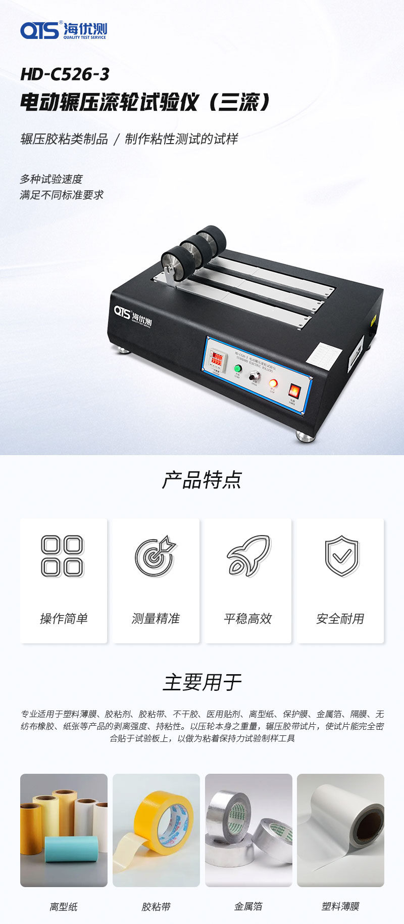 主要用于:專業適用于塑料薄膜、膠粘劑、膠粘帶、不干膠、醫用貼劑、離型紙、保護膜、金屬箔、隔膜、無紡布橡膠、紙張等產品的剝離強度、持粘性。以壓輪本身之重量,碾壓膠帶試片,使試片密合貼于試驗板上,以作為粘著保持力試驗制樣工具。