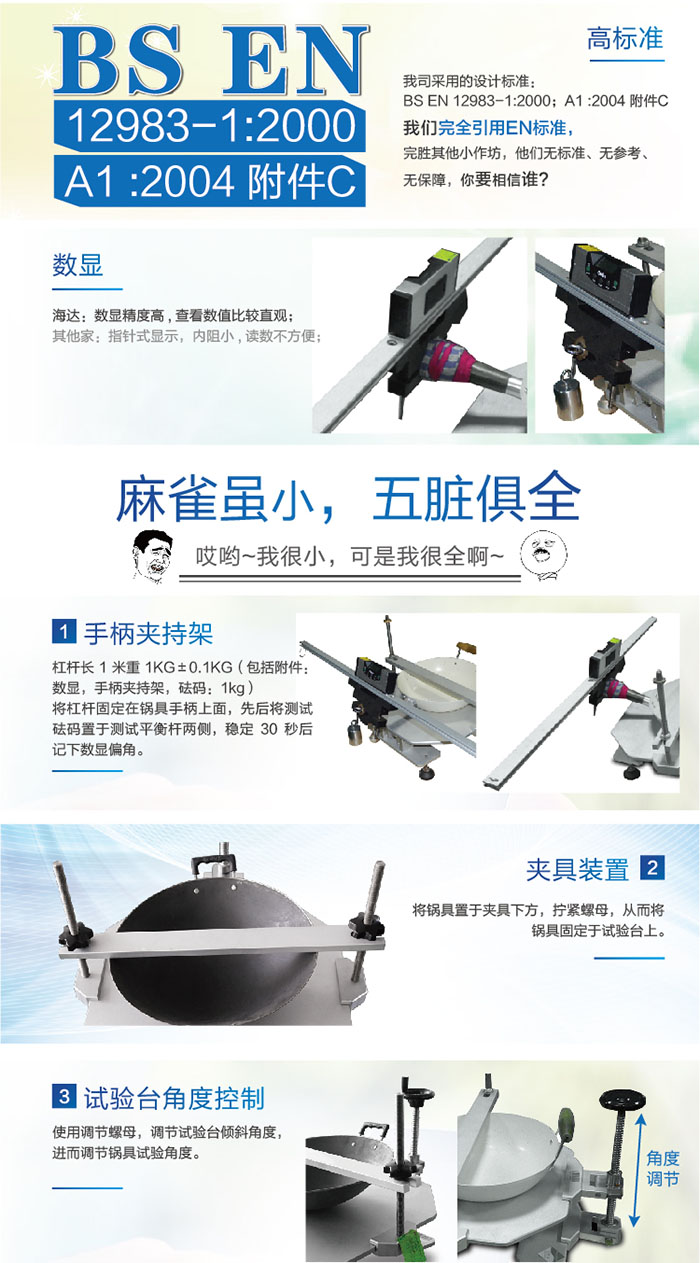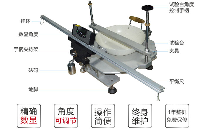 指標參數數顯角度尺BevelBox DP-180WM(2按鍵)平衡桿長1米重1KG±0.1KG(包括附件及指針,手柄夾持架)砝碼1kg最大樣品尺寸450×450×180mm(L*W*H)刻度分辨率0.1°外形尺寸1100×532×389mm(L*W*H) 把試樣固定在測試平臺上,調節緊固裝置的角度,使連接炊具手柄的平衡桿達到水平,同時指針指向分度表的零位。把測試砝碼分別懸掛于平衡桿的一端并保持靜止30s,角度尺記錄平衡桿偏轉的角度,檢查手柄和連接部件,記錄試樣的損壞情況。 操作步驟 1、將樣品預先做耐熱試驗;平橫桿長1m 、重1Kg±0.1Kg,其中包括附件及指針,手柄夾持架,安裝時夾持架圓心與手柄圓心重合,桿與手柄無相對移動; 2、將手柄組件在手柄長度方向的中點處與測試平衡桿緊固; 3、將測試樣品裝與測試機架上,并調整測試平衡桿使其水平; 4、將測試砝碼置于測試平衡桿左側,穩定30S后計下指針偏角; 5、將測試砝碼置于測試平衡桿右側,穩定30S后計下指針偏角; 6、檢查手柄及連接件,并記錄損害程度 | ||