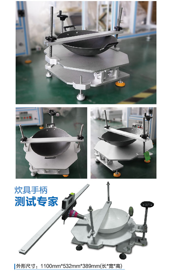 炊具手柄抗扭矩測試儀對廚具進行扭曲試驗,手柄在各個方向上的扭曲變形不超過10°,變形程度不能影響手柄的使用功能,試驗后緊固件無松動,以此評定廚具手柄抗扭矩等級。 設計標準:BS EN 12983-1:2000 + A1 :2004 | ||