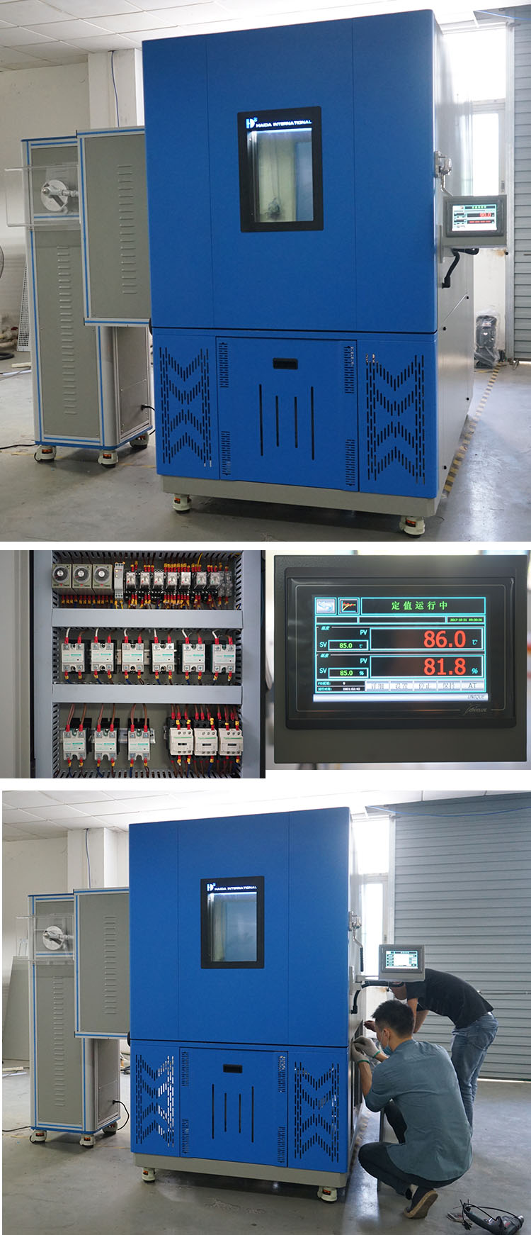 工作室容積7立方米(可定制)內箱尺寸 (W*D*H)1700×1700×2500mm外箱尺寸 (W*D*H)2400×3400×3050mm溫度范圍-70~+150℃溫度均勻度≤±2℃(空載,布置15點計量)發熱負載500kg鋁錠,13kW發熱量(滿載)溫度偏差≤±2℃(空載)滿載時溫度偏差±≤5℃(布置15點計量,計量時以較大升降溫速率設定,當出風口溫度到達設定溫度值時開始計時,5分鐘內溫度偏差≤5℃)溫度波動度≤±0.5℃(空載);滿載時溫度波動度:≤±1.0℃,出風口計量。升溫速度平均3度/分鐘,滿載升降溫速率70℃~-10℃≥5℃/min(全程平均);出風口測量;空載升降溫速率70℃~-10℃≥10℃/min(全程平均);出風口測量;溫度過沖≤5℃(布置15點計量);試驗箱風量≥17500CFM外壁材料不銹鋼板SUS #304或鍍鋅鋼板雙面噴漆,厚度不小于1.0mm;內壁材料不銹鋼板SUS #304,厚度不小于1.0mm;保溫材料箱體保溫材料為硬質聚氨酯泡沫或更優材質保溫材料,厚度≥100mm;試驗箱底板承重能力≥1000kg/㎡(均勻負載) 產品結構 1、整個箱體采用整體結構。箱體結構 2、箱體內側采用1.0mm進口SUS304B不銹鋼板,外側采用1.0mm 冷軋鋼板噴塑,保溫材料采用超細玻璃保溫棉。 3、大門密封采用雙層硅橡膠密封材料。 4、觀察窗為多層導電膜鋼化中空玻璃,尺寸大小為350×500mm為防止低溫時玻璃結霜,特設內置式特制安全電壓發熱絲環繞加熱帶供電電壓36V,并設有照明燈,為觀察提供照明。 5、在箱體側面設有帶塞子的φ50mm測試孔,塞子材料為硅橡膠低發泡,能耐高低溫,兼具保溫效能。 6、在箱體工作室后側設置有一個空氣調節柜,在其間安裝 加濕器、蒸發器、電加熱器、風機、風機蝸殼等設備。 7、溫度傳感器置于出風口。 8、試驗箱內的送風方式為上送風下回風方式制冷系統 1、溫度快速變化試驗箱制冷系統及壓縮機:為了保證試驗箱降溫速率和較低溫度的要求,本試驗箱采用一套泰康全封閉壓縮機所組成的二元復疊式風冷制冷系統。復疊式制冷系統包含一個高溫制冷循環和一個低溫制冷循環,其連接容器為蒸發冷凝器,蒸發冷凝器是也到能量傳遞的作用,將工作室內熱能通過兩級制冷系統傳遞出去,實現隆溫的目的。制冷系統的設計應用能量調節技術,一種行之有效的處理方式既能保證在制冷機組正常運行的情況下又能對制冷系統的能耗及制冷量進行有效的調節,使制冷系統的運行費用和故障率下降到較為經濟的狀態。 2、制冷劑:R404(高溫循環)、R23(低溫循環) 3、輔助件:膨脹閥(丹麥丹佛斯),電磁閥(意大利CASTEL); 4、過濾器(美國愛高);油離器(臺灣冠壓)等制冷配件均采用進口件。 | ||