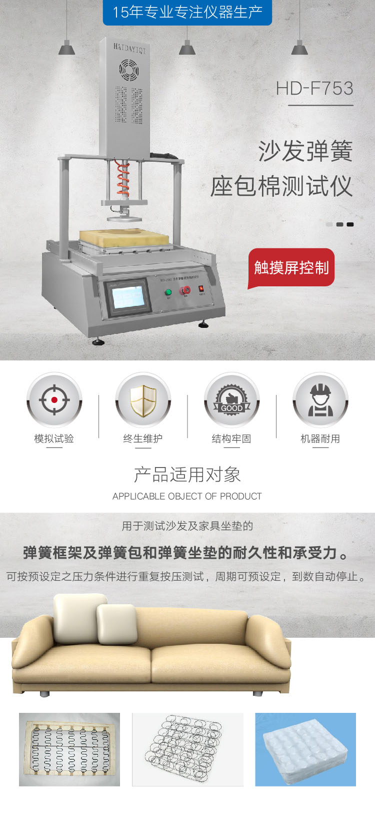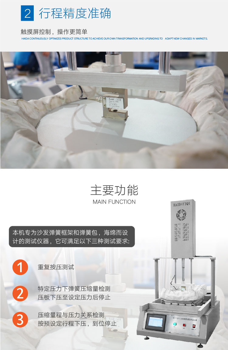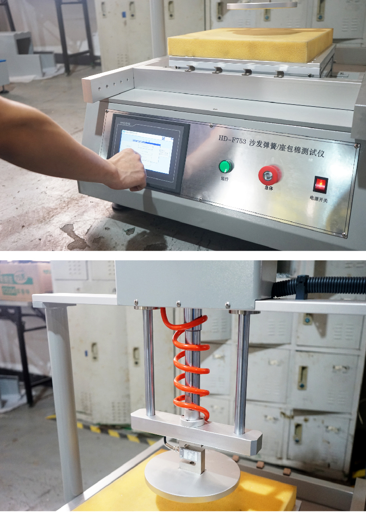 沙發彈簧測試儀用于測試沙發及家具坐墊的彈簧框架及彈簧包和彈簧坐墊的耐久性和承受力。可按預設定之壓力條件進行重復按壓測試,周期可預設定,到數自動停止。 | ||