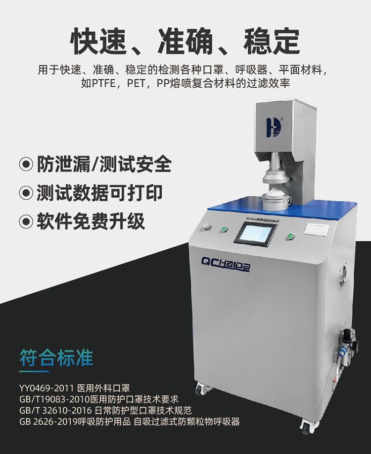 熔噴布顆粒物過濾效率測試臺(含通氣阻力測試)是用于檢測衛(wèi)生防護用口罩熔噴布的過濾性能,防護過濾效率,過濾效果的檢測裝置。熔噴布具有孔徑小、孔隙率高、過濾效率高等特點,作為口罩生產(chǎn)的核心材料對規(guī)范熔噴布企業(yè)生產(chǎn)經(jīng)營行為、保證口罩核心原材料質(zhì)量發(fā)揮積極作用。 現(xiàn)有少量現(xiàn)貨,價格實惠,預購從速,先到先得! 詳詢13390877155 設計標準: ①、T/JSFZXH001-2020《口罩用聚丙烯熔噴非織造布》 ②、GB2626-2019呼吸防護用品自吸過濾式防顆粒物呼吸器 ③、GB/T32610-2016日常防護型口罩技術規(guī)范 ④、GB/T19083-2010醫(yī)用防護口罩技術要求 ⑤、YY0469-2011醫(yī)用外科口罩產(chǎn)品特點 ①、全程顆粒物防泄漏設計,保護實驗人員安全; ②、檢測艙配置操作手套,方便待檢口罩的更換; ③、兼容口罩和呼吸器類試樣測試顆粒物防護效果和過濾效率。 |