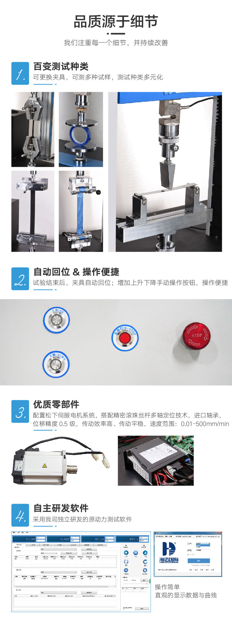1、容量:傳感器2T; 2、電機:松下400W伺服電機; 3、驅動器:400w伺服驅動器; 4、絲桿:進口滾珠絲桿; 5、電腦控制,windows模式操作; 6、速度:速度可調(電腦調節) 0.1-500mm/min; 7、滿載行程1200mm(含夾具); 8、跨距≤400mm; 9、荷重分解度:1/250,000; 10、荷重精度:≤0.5%; 11、單位切換gf/kgf/N//kN/LBf/W/T ; 12、外形尺寸:(L*W*H)880*510*1490mm; 13、重量:約150KG 15、電源:1∮ AC 220V