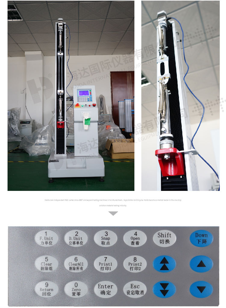 主要技術參數: 1、容量:5-500kg國產傳感器, 2、電機:歐邦調速電機180W, 3、減速機:1/30減速機; 4、絲桿:進口滾珠絲桿; 5、控制方式:面板控制(LCD顯示),可連電腦,windows模式操作; 6、速度可調(旋鈕調節)50-300mm/min(手動調節); 7、最大行程:1400mm(含夾具); 8、荷重分解度:1/100,000; 9、荷重精度:≤0.5% 10、單位切換:gf/kgf/N/LBf 11、外形尺寸L*W*H:550*430*1700mm 12、重量:約85KG