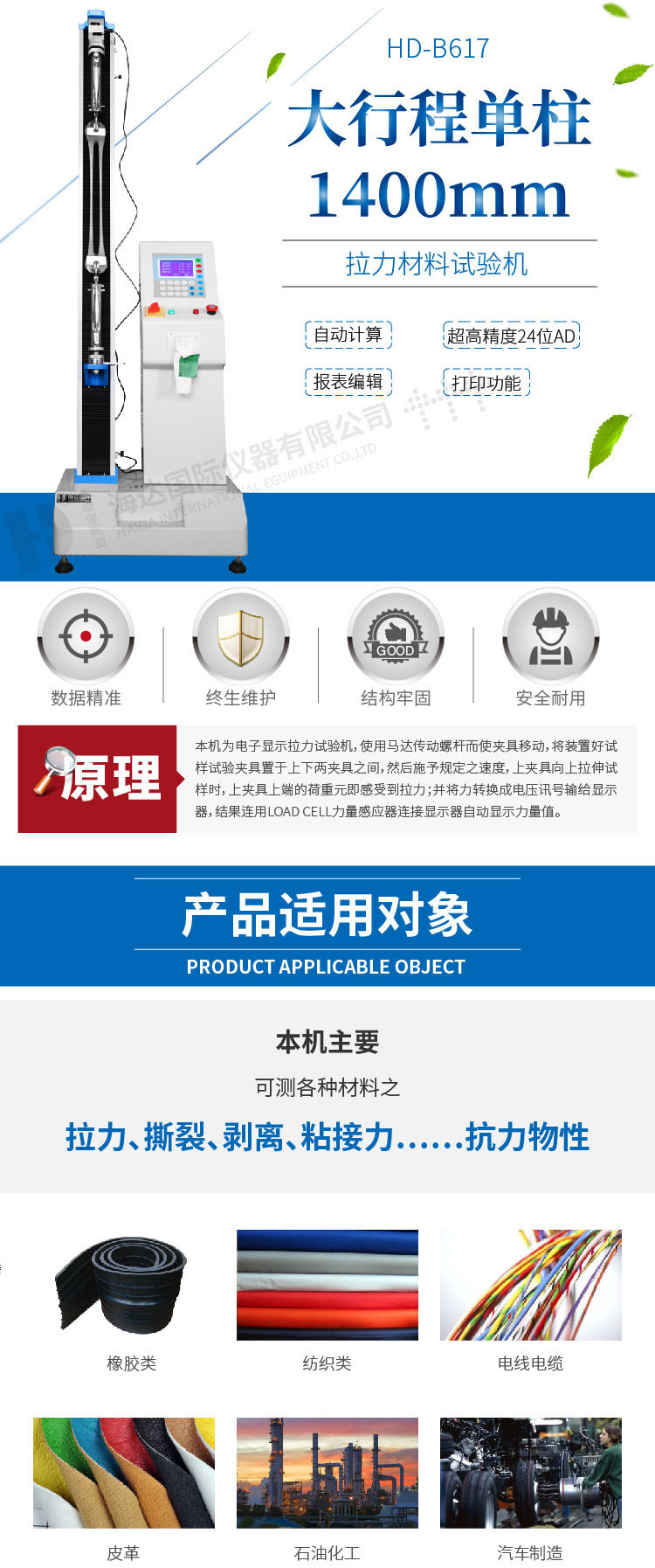線材端子拉力試驗機HD-B617測試各種材料、半成品及成品的抗拉強度、抗壓強度及伸長量,可做剝離、撕裂、抗彎、抗折、壓縮等試驗,適合金屬、塑料、橡膠、紡織品、合成化學制品、電線電纜、皮革等行業使用 設計標準:GB/T 16491、GB/T 1040、GB/T 8808、GB/T 13022、GB/T 2790、GB/T 2791、GB/T 2792、GB/T 16825、GB/T 17200、GB/T 3923.1、GB/T 528、GB/T 2611、GB/T 6344、GB/T 20310、GB/T 3690、GB/T 4944、GB/T 3686、GB/T 529、GB/T 6344、GB/T 10654、HG/T 2580、JC/T 777、QB/T 2171、HG/T 2538、CNS 11888、JIS K6854、PSTC-7、ISO 37、AS 1180.2、BS EN 1979、BS EN ISO 1421、BS EN ISO 1798、BS EN ISO 9163、DIN EN ISO 1798、GOST 18299、DIN 53357、ISO 2285、ISO 34-1、ISO 34-2、BS 903、BS 5131、DIN EN 12803、DIN EN 12995、DIN53507-A、DIN53339、ASTM D3574、ASTM D6644、ASTM D5035、ASTM D2061、ASTM D1445、ASTM D2290、ASTM D412、ASTM D3759/D3759M | ||