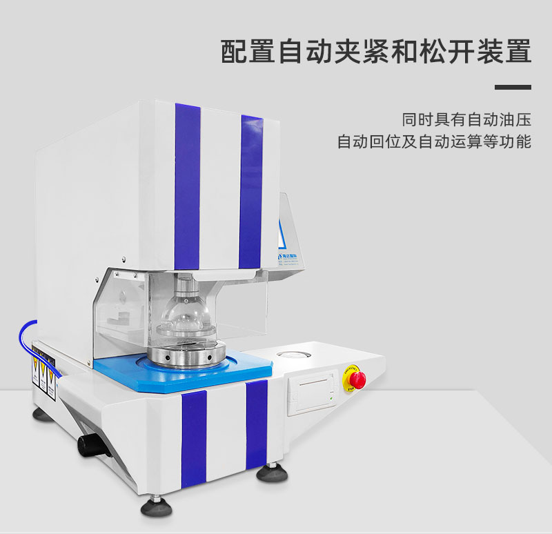 全自動破裂強度試驗儀是針對紙和紙板的強度性能進行檢測的儀器,主要適用于各種紙板及單層和多層瓦楞紙板的測試,也可用于絲綢、棉布等非紙質材料的耐破強度測試。 設備特點: 1.自動化程度高,配置自動夾緊和松開裝置,同時具有自動油壓、自動回位及自動運算等功能; 2.自帶快速、高質量的微型打印機,可輸出完整詳盡的測試數據報表。 1.控制系統采用本公司自主研發測試軟件,可完成所有試驗參數設定、工作狀態控制、數據采集及分析處理、結果顯示; 2.本機配置亞克力防護裝置,破裂過程清晰可見。 操作原理 在儀器密封的油缸和壓紙座的容腔內,裝滿甲基硅油作為壓力傳遞的介質,當電機帶動活塞勻速前進時,橡皮膜受到硅油的加壓而突起,此時夾持在膠膜上方,被上下夾盤固定住的試樣,均勻受力,直到試樣破裂,處理芯片鎖住最大壓力值,通過液晶屏顯示該壓力值,此壓力值即為本次試樣的耐破度。 設計標準:JIS-L1004、JIS-L1018、JIS-L1031、JIS-K6328、JIS-P8131、JIS-P8112、ASTM-D2210、TAPPI T403、ISO2759-2001、GB/T 1539、GB/T 1057 | ||