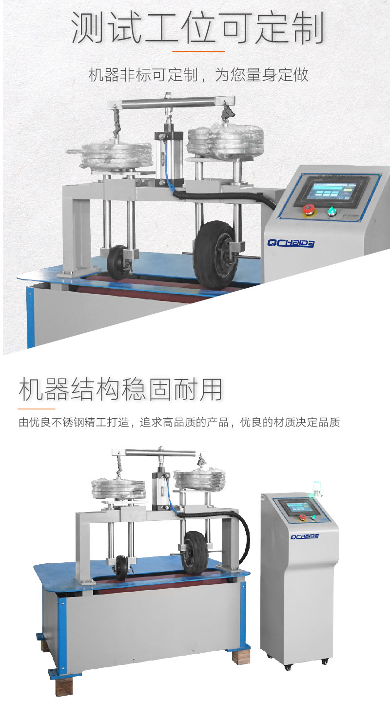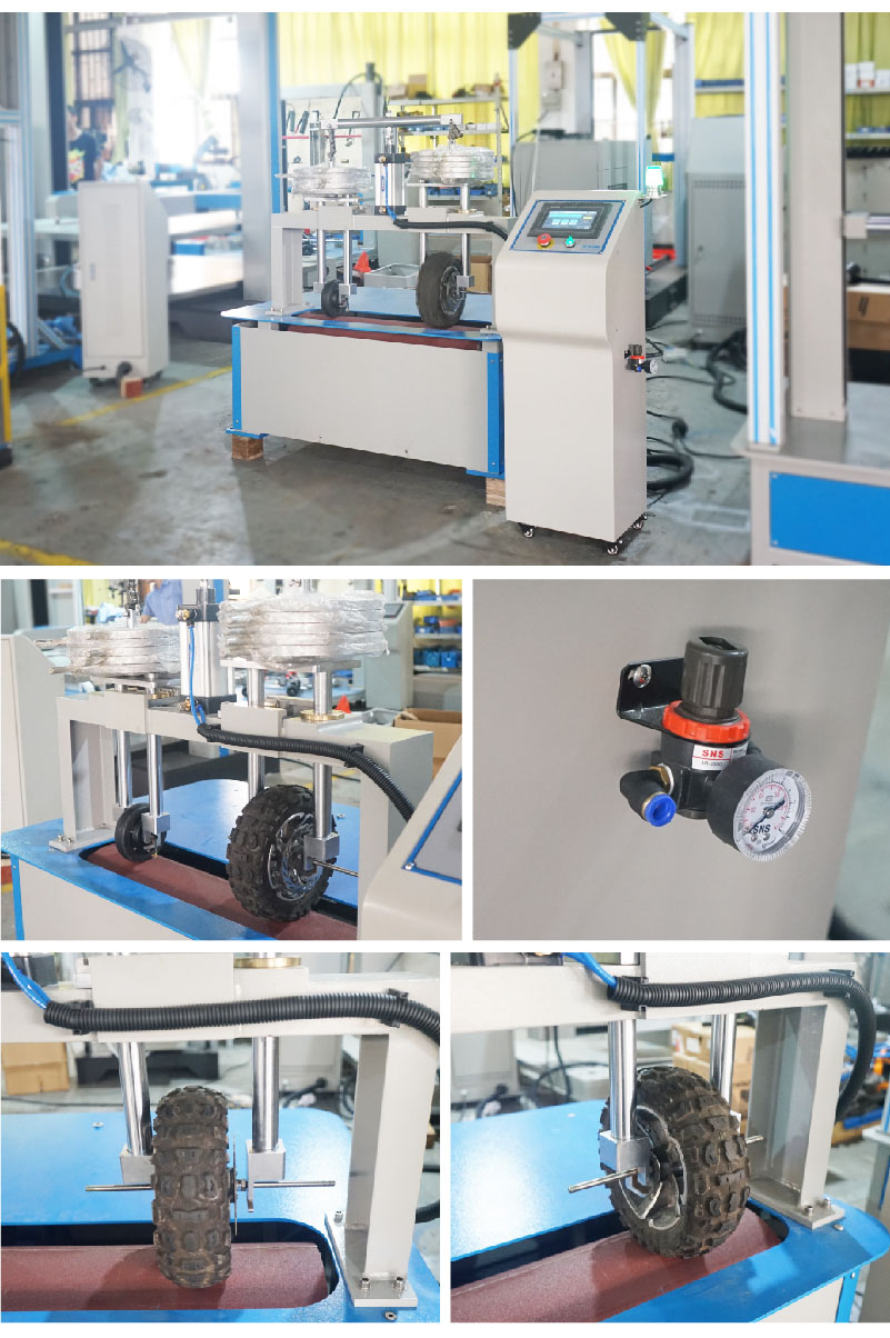 滑板車輪子耐磨測試機適用于小型輪子的耐磨試驗,如旅行箱、滑冰鞋、童車、手推車的輪子。可測得輪子材料的耐磨性及整體結構有無磨損及變形,試驗的結果可供作改進的參考。 測試方法:置模型嬰兒于車臺中,將車臺固定于測試臺上,調整輸送帶速度1.4±0.1m/sec(5kw/h±3.6 kw/h)。持續測試64小時后,目視車臺有無損壞。達設定次數能自動停止操作。試驗速度:可調LED顯示 時間設定:9999 分鐘負荷:重量(約):約95kg 設計標準:滿足QB/T 2917-2007 |