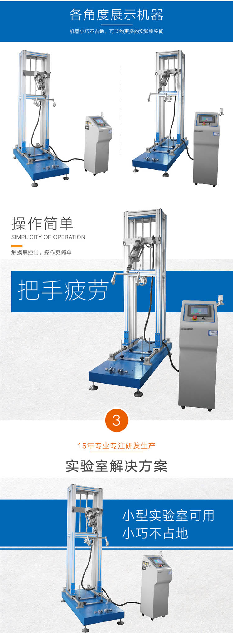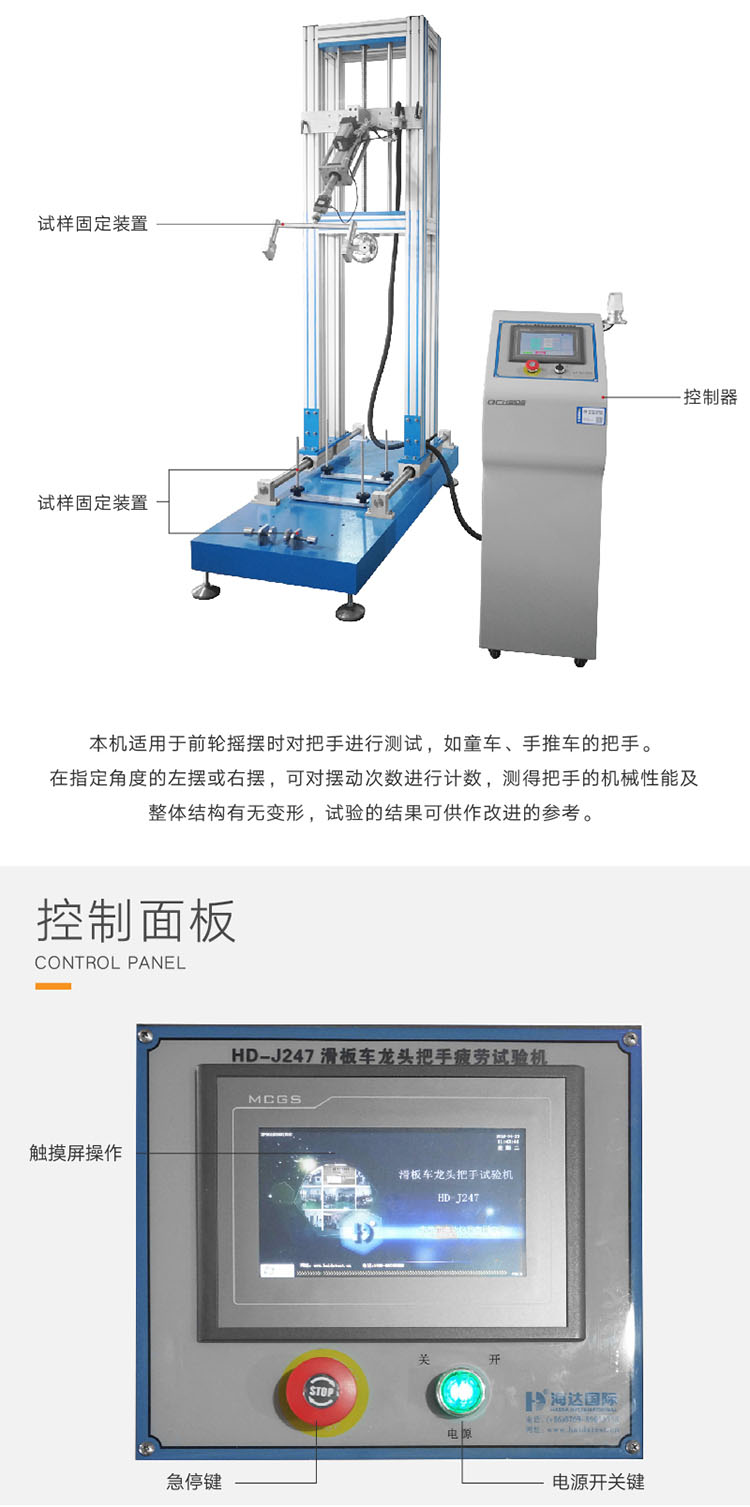 滑板車龍頭手把桿疲勞試驗機適用于前輪搖擺時對把手進行測試,如滑板車、童車、手推車的把手。滑板車在使用時,人對車把手會產生一個按壓或拉伸的力,本儀器便是模擬這種循環拉壓過程,來觀察記錄滑板車把手機械性能及整體結構的疲勞情況。 測試方法: 固定滑板車的踏板, 使它不能移動, 固定滑板車的前輪, 使它不能轉向. 在距離兩個把手的末端1英寸處, 施加一個60磅的力, 從一個”向后 / 向上” 的, 和地面形成一個45°角的方向施加, 然后又從一個相對的 向前 / 向后” 的方向施加. 測試進行總共5000個循環, 速度為不超過每秒鐘一個循環。 設計標準:ASTM F2264 產品特點: (一)硬件特點 1.夾具高度可調,以適應不同尺寸的滑板車、童車、手推車等; 2.機器外觀采用烤漆噴涂工藝,其他零部件采用不銹鋼材、鋁型材等,防銹能力高、外型美觀; 3.通過絲杠軸承調整力臂高度位置以適應不同高度的滑車,高度調節位置處選用快拆式螺絲,便于拆卸。 (二)軟件特點 1.采用觸摸屏PLC程序控制,可進行循環次數、測試力值、推到力延時、拉到力延時及測試速度等的參數設置; 2.可進行龍頭水平推拉和45°推拉測試; 3.過載保護、限位保護、過壓保護、斷電記憶、自動回位等設計,保障設備的操作安全。 |