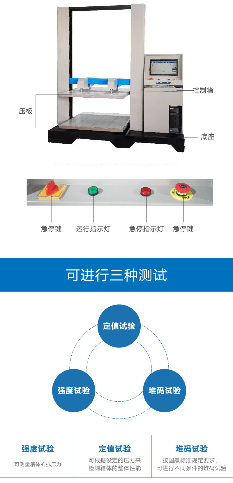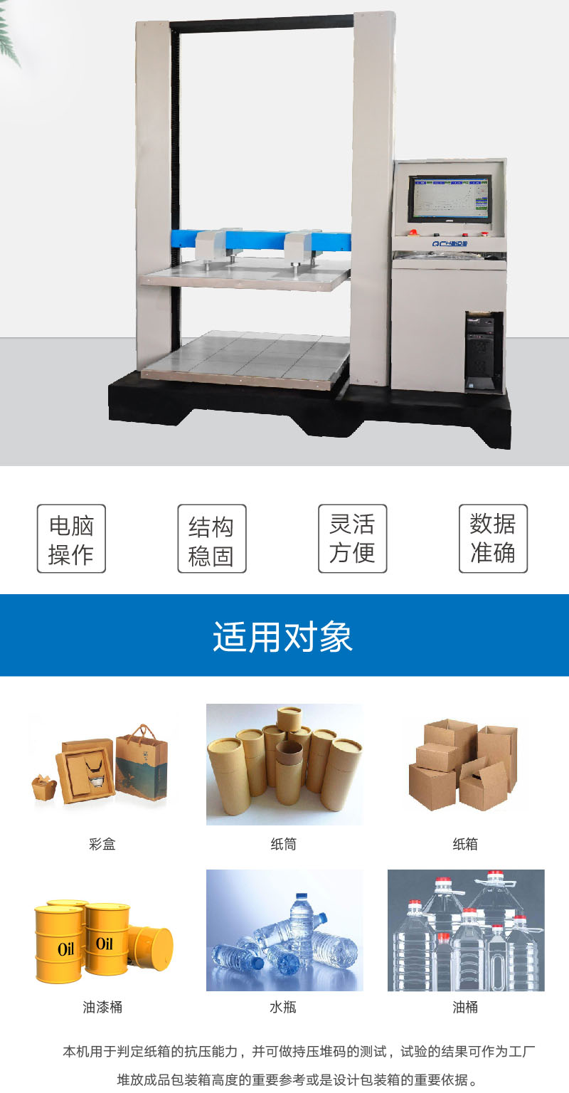 計算機伺服紙箱抗壓試驗機HD-A505S-1200是檢驗紙箱或其它包裝容器耐壓強度最直接的測試儀器,用于判定紙箱的抗壓能力,并可做持壓堆碼的測試,試驗的結果可作為工廠堆放成品包裝箱高度的重要參考或是設計包裝箱的重要依據。適用于瓦楞紙箱、蜂窩板箱等包裝件的耐壓、形變、堆碼試驗。并兼顧塑料桶(食用油、礦泉水)、紙桶、紙盒、紙罐、集裝容器桶(IBC桶)等容器的抗壓試驗。 設計標準:TAPPI-T804,JIS-20212,GB4857.3.4, ASTM-D642, QB/T1048, BS EN ISO 12048, GB/T4857.16, GB/T8167, GB/T8168, GB/T4857.3,GB/T4857.4 | ||