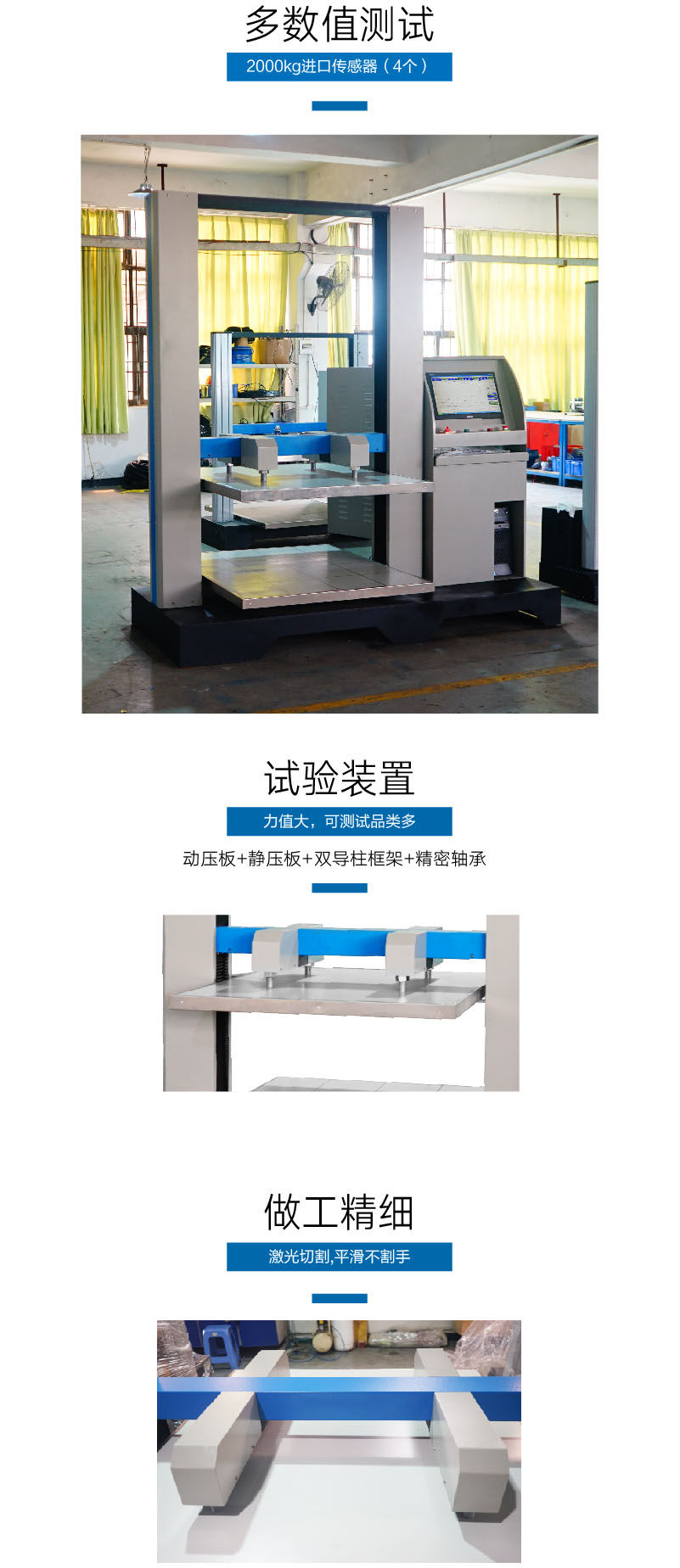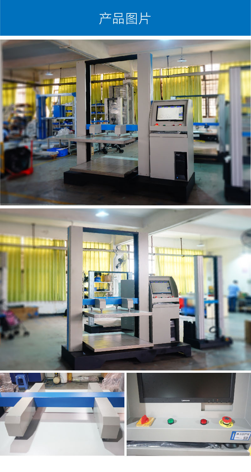容量 20kN傳感器 測試空間 約1000mm×1200mm×1000mm(L*W*H) 外形尺寸 約1800mm×1200mm×1700mm(L*W*H) 升降速度 0.1~200mm/min 分解度 1/250,000 荷重精度 ±0.5%F.S. 電 機 400W伺服電機 驅動器 400W伺服驅動器 絲 桿 滾珠絲桿 單位切換 gf/kgf/N//kN/Ibf/T 報表輸出 Windows模式輸出、Office模式輸出 控制方式 電腦控制,windows模式操作 重 量 約700kg 電 源 1∮ AC 220V 整機功率 約550W 主要測試項目 紙箱抗壓試驗、紙箱堆碼試驗 | ||